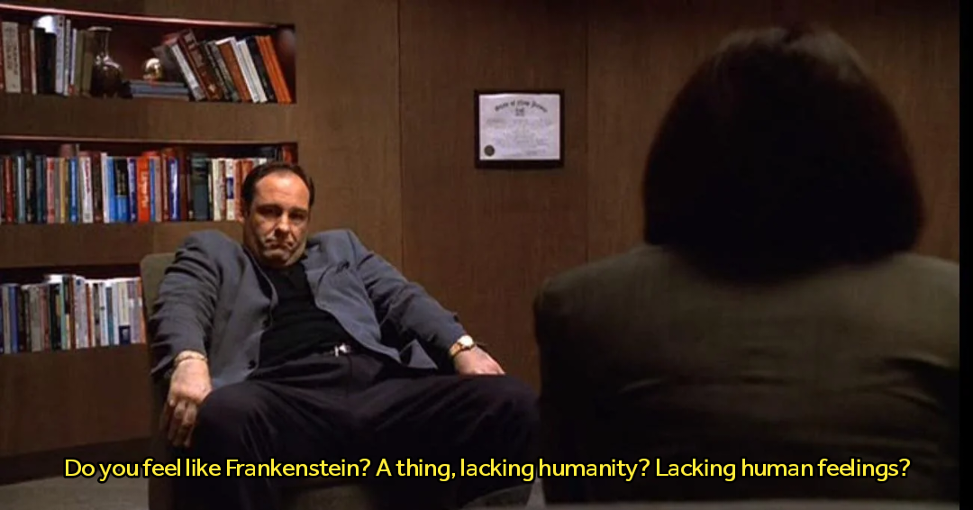 Tony’s masculinity is often built like a meat locker: cold, rigid, and full of unspoken rot. His entire world is built on dominance, intimidation, and the performance of power. In many ways, Tony’s therapy sessions are a masterclass in Symbolic Interactionism—where life's a stage and we are all just performing the roles we think we’re supposed to play. And yet, his real unraveling happens when those roles start to crack. Husband. Patriarch. Provider. Mobster. Each of them comes with rules he didn’t write but must follow anyway.